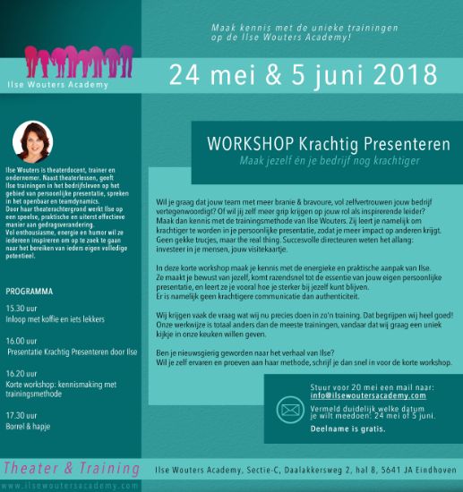 Wil je graag dat jouw team met meer branie & bravoure, vol zelfvertrouwen jouw bedrijf vertegenwoordigt? Of wil jij zelf meer grip krijgen op jouw rol als inspirerende leider? Maak dan kennis met de trainingsmethode van Ilse Wouters. Zij leert je namelijk om krachtiger te worden in je persoonlijke presentatie, zodat je meer impact op anderen krijgt. Geen gekke trucjes, maar the real thing. Succesvolle directeuren weten het al lang: investeer in je mensen, jouw visitekaartje. In deze korte workshop maak je kennis met de energieke en praktische aanpak van Ilse. Ze maakt je bewust van jezelf en komt razendsnel tot de essentie van jouw persoonlijke presentatie. Er is namelijk geen krachtigere communicatie dan authenticiteit. Wij krijgen vaak de vraag wat wij nu precies doen in zo’n training. Dat begrijpen wij heel goed! Onze werkwijze is totaal anders dan de meeste trainingen, vandaar dat wij graag een uniek kijkje in onze keuken willen geven. Ben je nieuwsgierig geworden naar het verhaal van Ilse? Wil je zelf ervaren en proeven aan haar methode, schrijf je dan snel in voor de korte workshop op 24 mei of 5 juni.